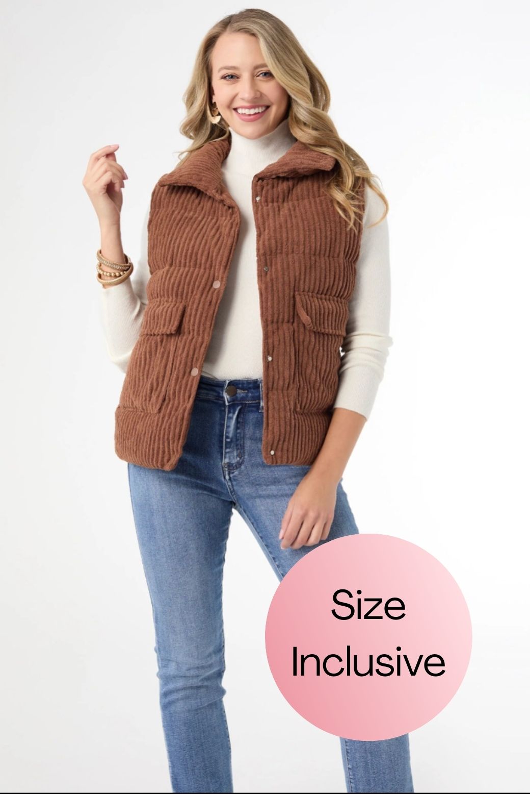 Stay warm and chic this fall with the Nicky Corduroy Down Filled Vest. Crafted from soft corduroy and insulated with premium duck down, it offers exceptional comfort and warmth on crisp autumn days. Perfect for layering over your favorite sweater, this vest combines effortless style with cozy functionality to elevate your seasonal wardrobe.