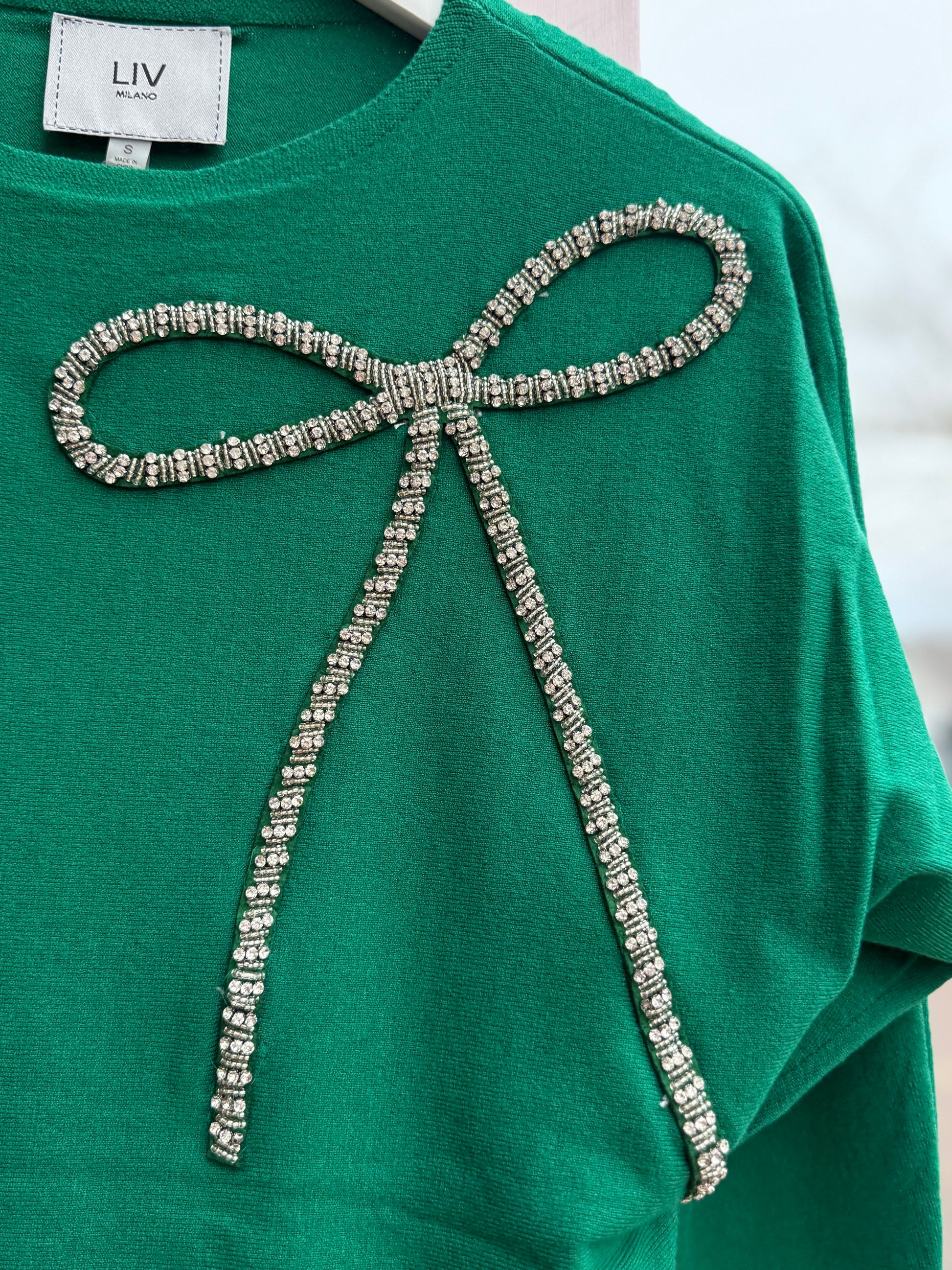 Elevate your everyday style with this captivating knit sweater featuring an oversized bedazzled bow that catches the light beautifully. The luxuriously soft dolman sleeves drape effortlessly for a flattering, comfortable fit that works from office to weekend. Eye-catching sparkle meets cozy sophistication—a statement piece that transforms any outfit into something special. Perfect for those who love fashion-forward details with undeniable charm.